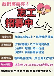 我們需要您!!!志工召募中,歡迎您加入我們的行列~ 臺中市霧峰區衛生所 2025-08-20 儲備志工召募中!! 只要您有一顆熱忱的心,願意無私服務貢獻,歡迎您與我們聯絡 志工需求:1.可配合每月排班輪值或是機動出勤,有長期服務意願者佳 2.18歲以上在學學生或是一般民眾 3.具有志工紀錄冊或願意接受志工基礎及特殊訓練 聯絡電話:04-23393022分機210林主任