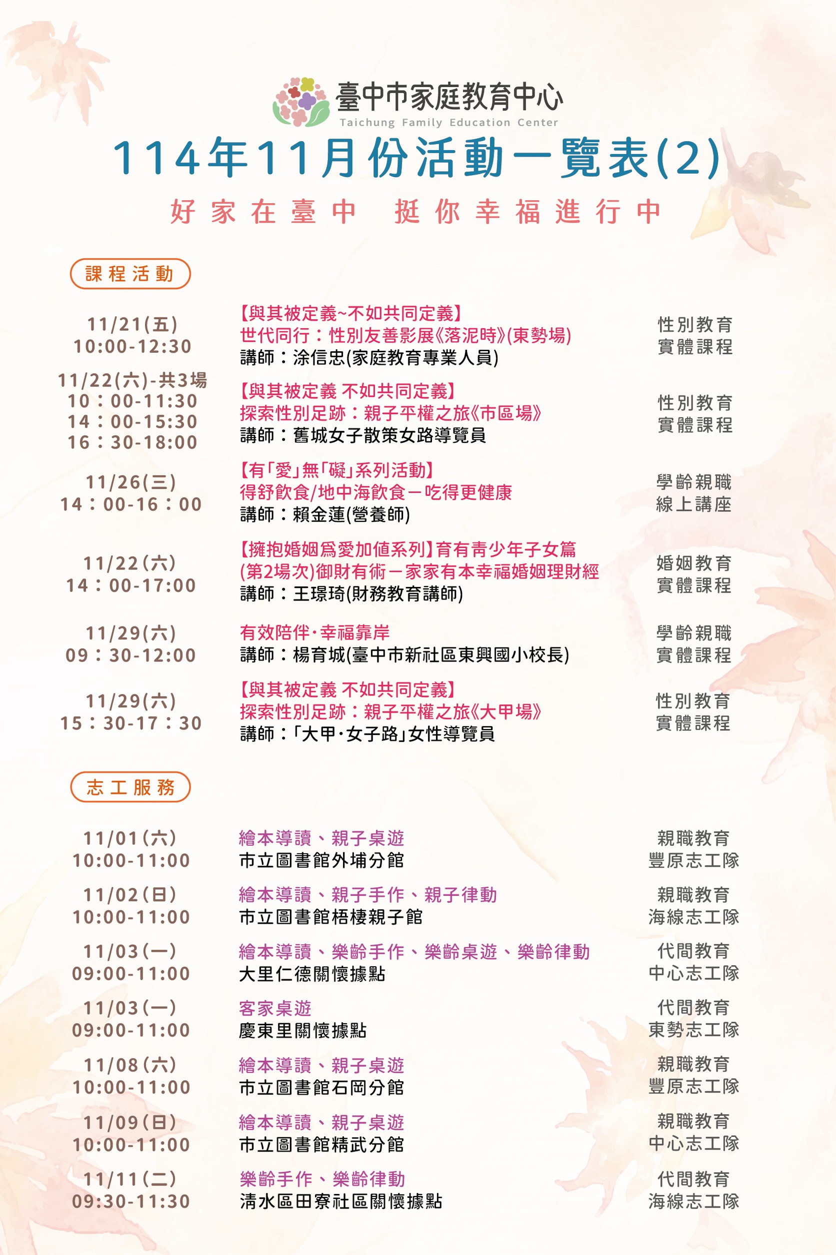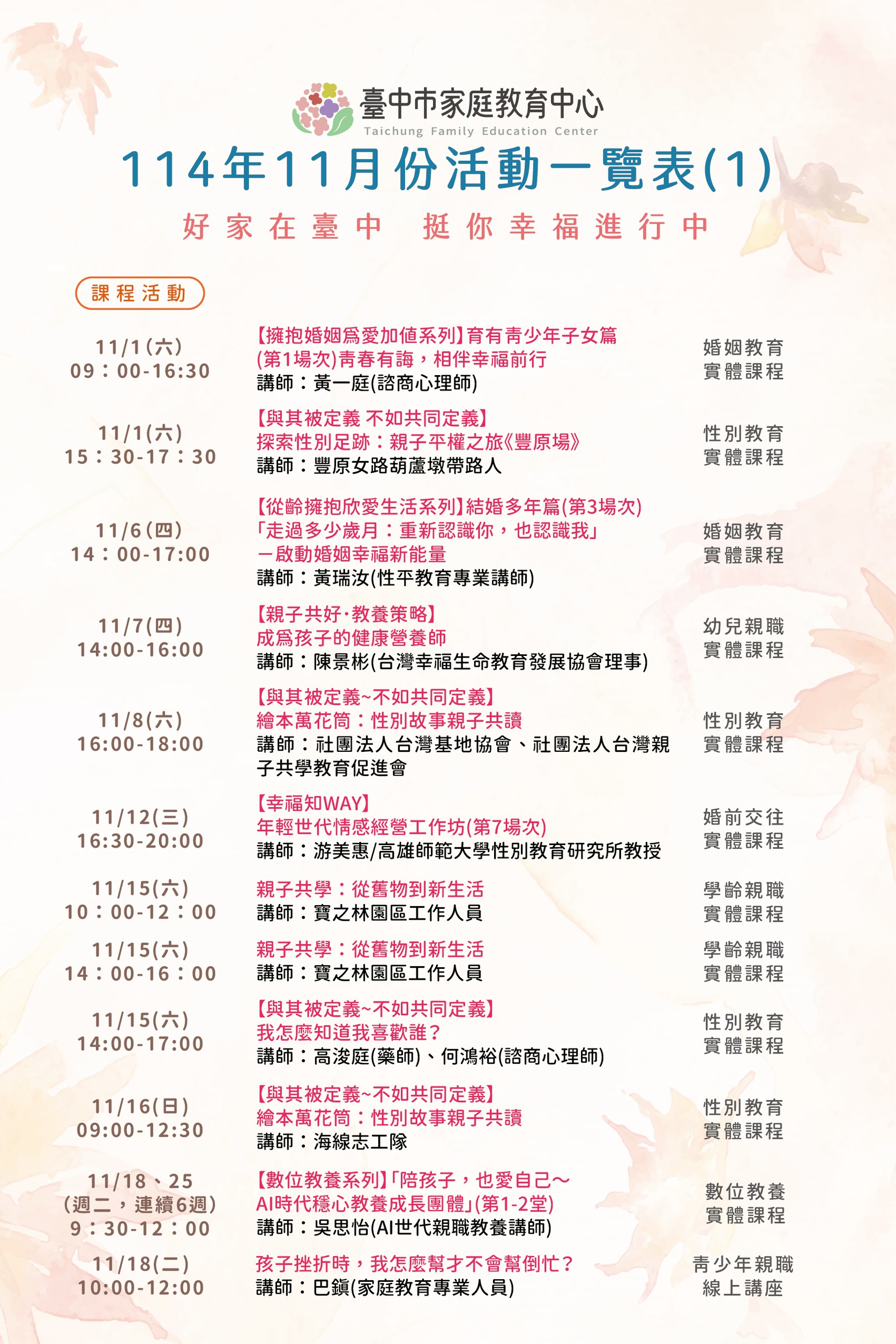 臺中市家庭教育中心邀您一起參與本月精彩多元的課程活動~從親職教育、數位教養、婚姻經營、青少年溝通、情緒管理、幼兒教養到到多元型態家庭學習、婚前交往準備等主題應有盡有,讓我們在溫馨互動的氛圍中學習,累積創造幸福、和諧家庭的力量! 更多詳細內容洽本中心活動海報、FB及LINE公告資訊 歡迎加入FB官方粉絲專頁、按讚、分享及追蹤更豐富的活動資訊